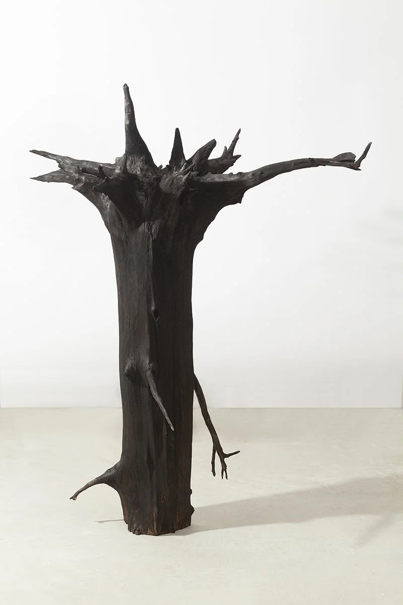 The surfaces of found cedar roots are torched to reveal, preserve and honor their natural forms. Their branching arm-like structures extend outward, echoing systems of growth and exchange, suggesting an ongoing search for nourishment and connection.