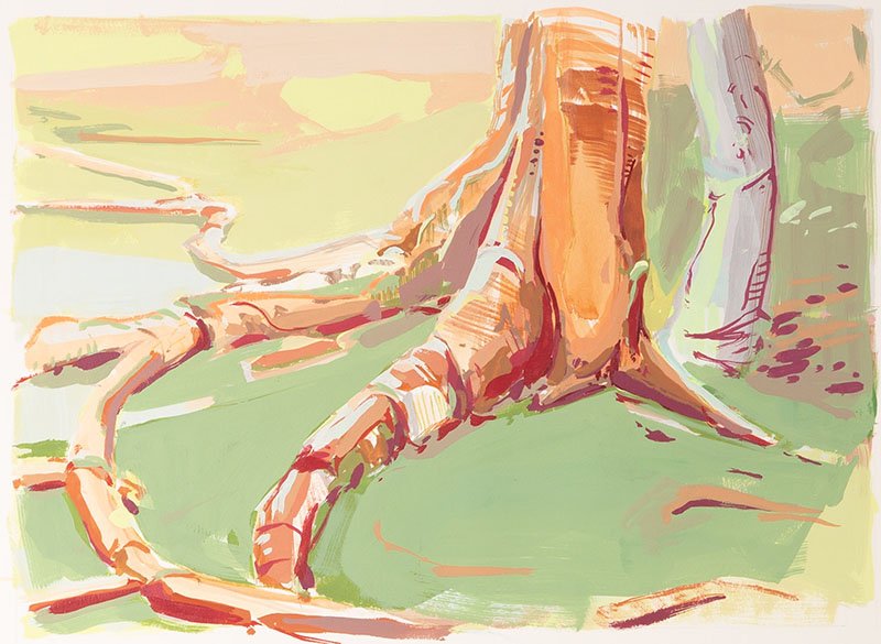 My sites are curious places that invite an investigation of both the self and the surroundings. Like Henry Wadsworth Longfellow, I seek the harmonies and discords between the human and the wild. On this uneven ground, between glacial erratic and dying beech, I write my love letters in ink and paint. Their words are composed of varying hues and gestural marks—a transcendent, constructed tongue used to talk to the mute.